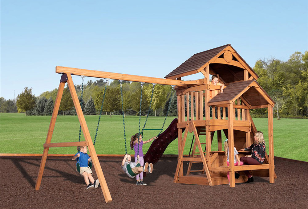 The Adventure Outlook 2 swing set doesn’t compromise on quality. The fort structure has a 5′ high deck with over 20 sq. ft. of play space. This play structure also includes a wood roof, gable kit, 3 position 8′ swing beam, 2 – belt swings, trapeze bar, lower floor, playhouse serving wall, side table with roof, 5′ rock wall, and double wall wave slide. Summit Outlook play sets include a limited lifetime warranty on all wood, metal, and hardware components.