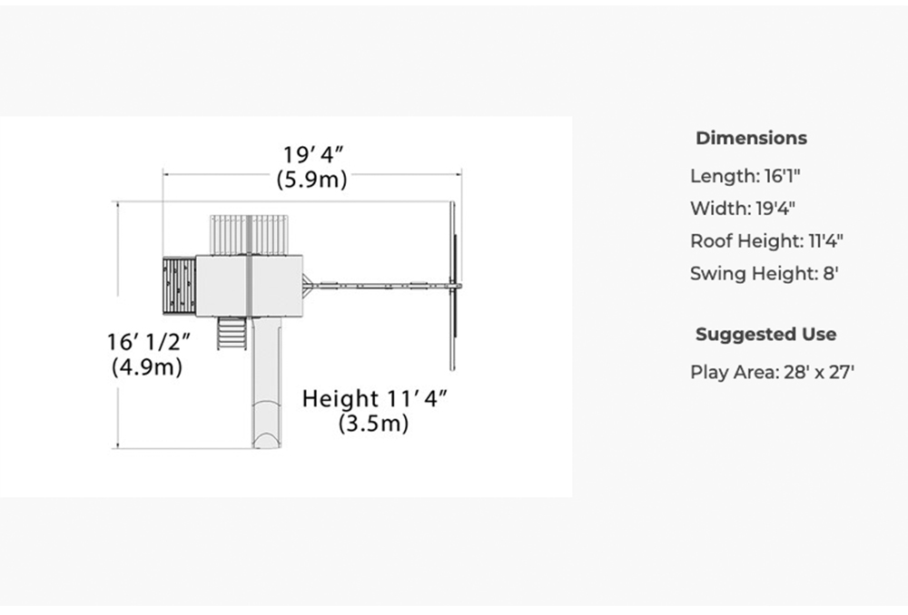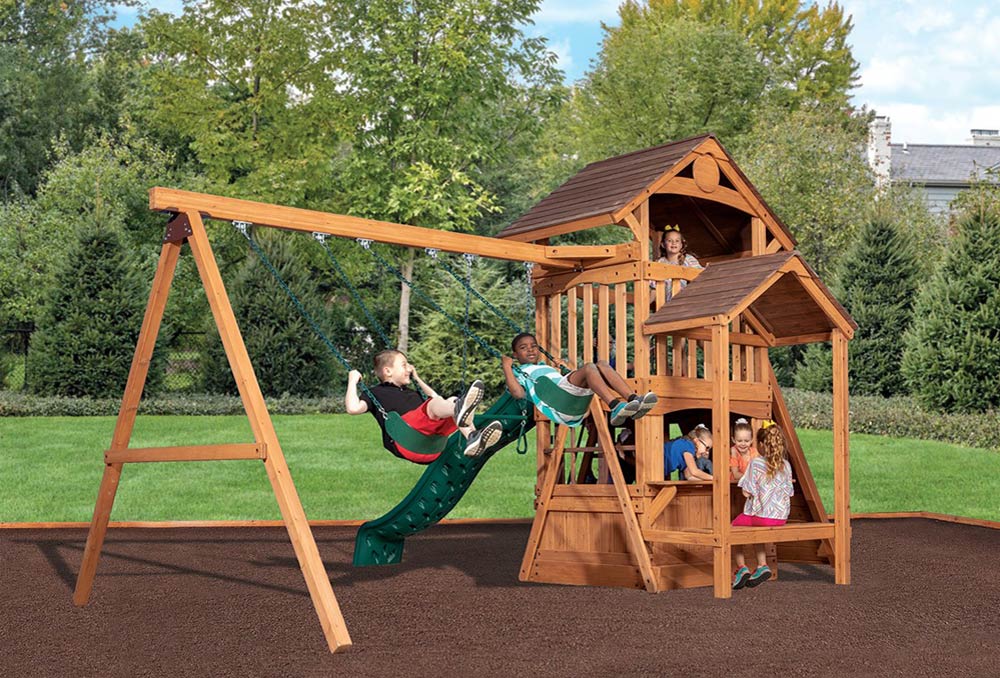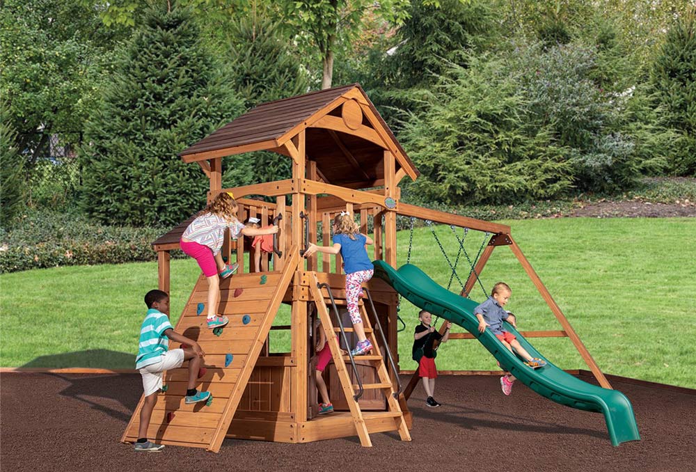 The Adventure Outlook 3 swing set is exactly what you’ve been looking for. The fort structure has a 5′ high deck with over 20 sq. ft. of play space. This play structure also includes a wood roof, gable kit, 3 position 8′ swing beam, 2 – belt swings, trapeze bar, playhouse, side table with roof, 5′ rock wall, and double walled wave slide. Summit Outlook play sets include a limited lifetime warranty on all wood, metal, and hardware components.
