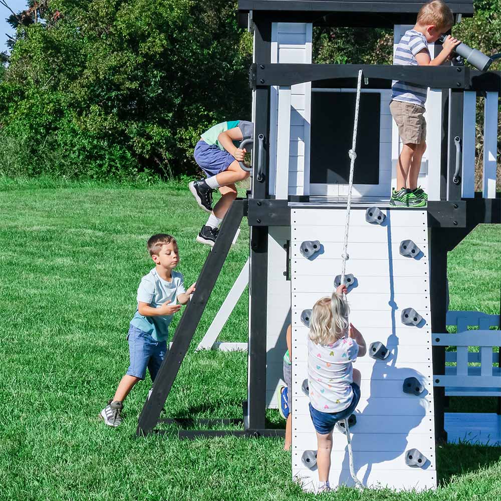 • Elevated Adventure: Raised clubhouse with two balconies, a wooden roof, steering wheel, toy telescope, and chalkboard is perfect for outdoor play