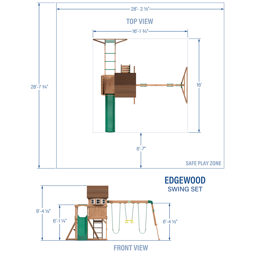 The Backyard Discovery Edgewood wooden swing set turns your outdoors into your kids favorite place to play. The upper clubhouse offers a spacious hangout spot, complete with a full front door, working doorbell, bay windows, a balcony, and wooden roof that makes it perfect for all of their adventures. Below, the shaded space is perfect for toy storage, while the snack bar window is a great spot for serving up treats and taking a quick break. It features two belt swings and a trapeze letting multiple kids swing at the same time, and the monkey bars add a fun physical challenge that builds real strength over time. The 8-foot wave slide creates a speedy ride from the clubhouse, and the wide step ladder makes climbing back up easy for kids of all ages. It’s built from solid cedar that’s naturally resistance to rot and decay, so this kids swing set holds up year after year, while our comprehensive 5-year warranty backs that durability. This backyard swing set kit comes ready to assemble with pre-cut, pre-drilled, and pre-stained pieces, plus step-by-step guided instructions through the interactive BILT® app. The Edgewood is designed for years of outdoor adventures that inspire little imaginations.