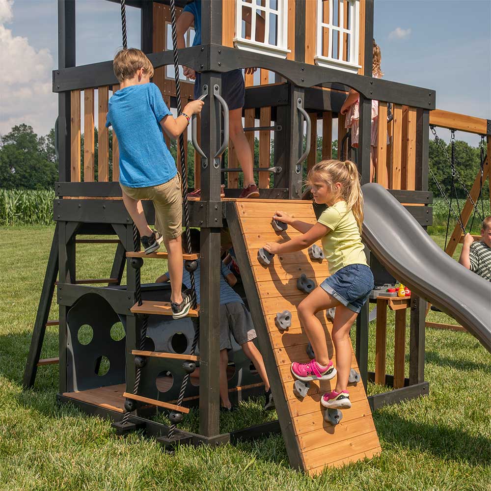 • Rock Climbing Wall: Adventurous rock wall with 10 holds encourages playful climbing challenges and skill-building