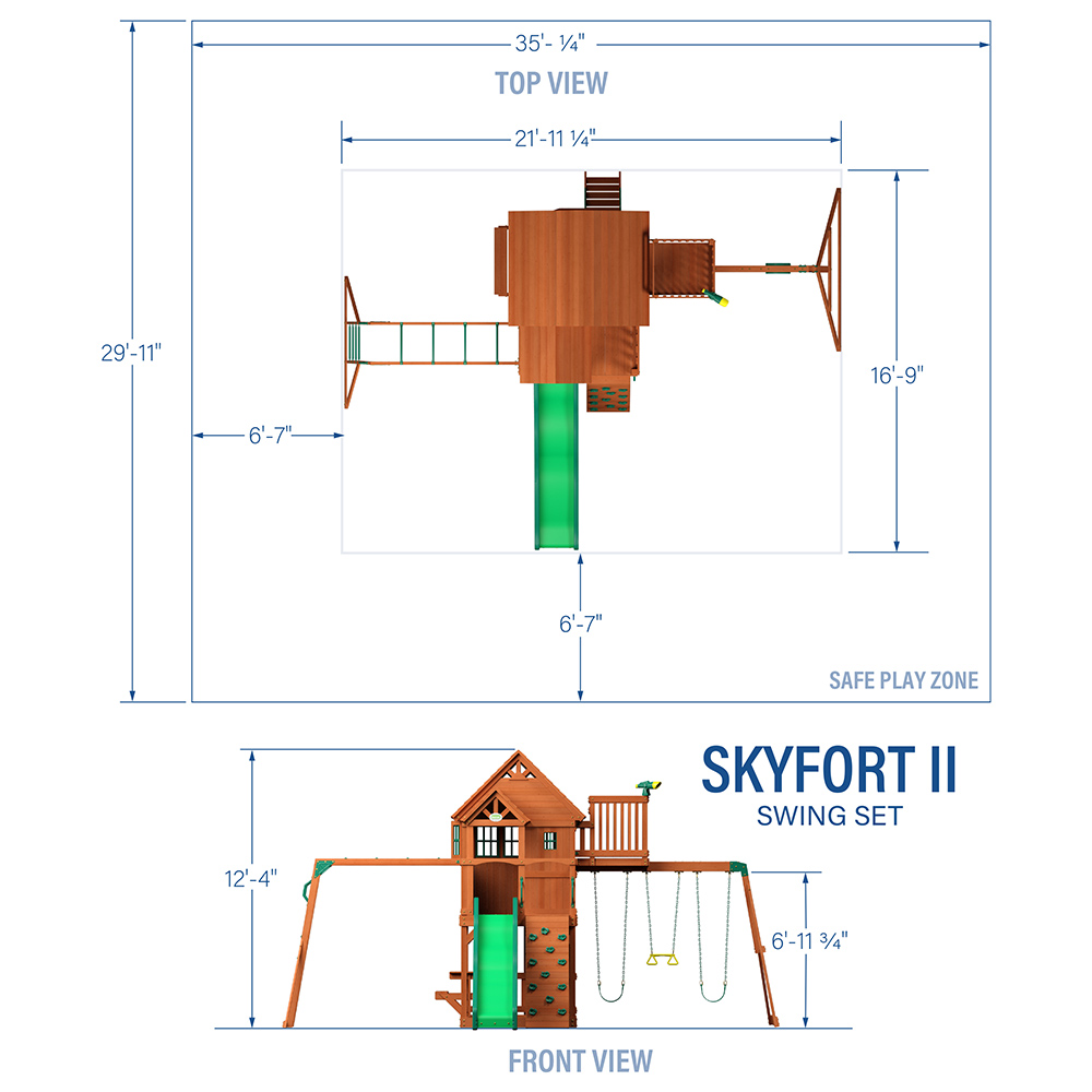 Bring ultimate adventure to your backyard with the Skyfort II Swing Set from Backyard Discovery. This towering wooden swing set transforms your outdoor space into a magical playground, featuring a raised clubhouse complete with a wooden peak roof and charming bay windows that provide the ideal setting for endless fun. Up in the crow’s nest lookout, little explorers can spot distant lands through the included toy telescope and plan their next quest. Kids can challenge themselves on the monkey bars, swinging from rung to rung as they build confidence and strength, while the rock wall offers a fun climb up to the spacious balcony. The speedy 10-foot wave slide delivers an exhilarating ride back to ground level, ensuring smiles with every descent. A lower shaded deck provides a cool retreat where kids can relax or play in the sandbox area, while the attached picnic table with benches creates the perfect spot for enjoying snacks, drawing pictures, or crafting with friends. Ready to assemble and designed with engaging features, this backyard swing set combines classic playground fun with imaginative spaces where children’s creativity can soar. Let the Skyfort II become your children’s favorite outdoor destination, creating endless memories and adventures together.