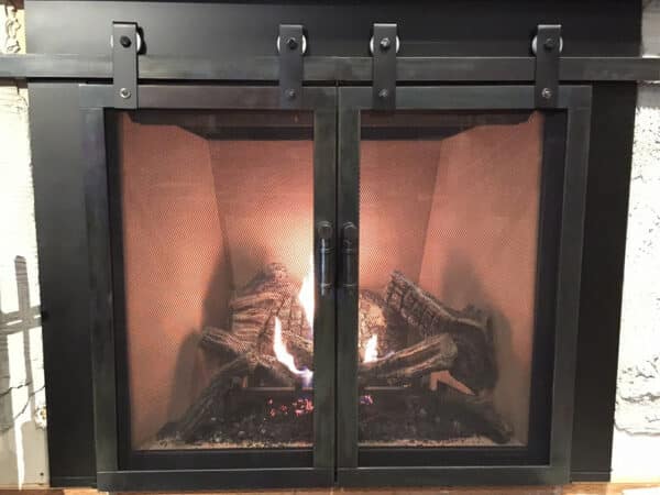 If you aren’t in love with a folding door design our barn door option may be perfect for you. An iron track located above the doors allows them to glide to either side of your fireplace opening.