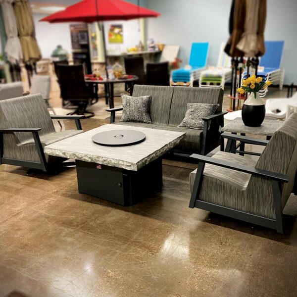 Includes || loveseat, 2 swivel rockers, 24” end table, 42” square fire pit