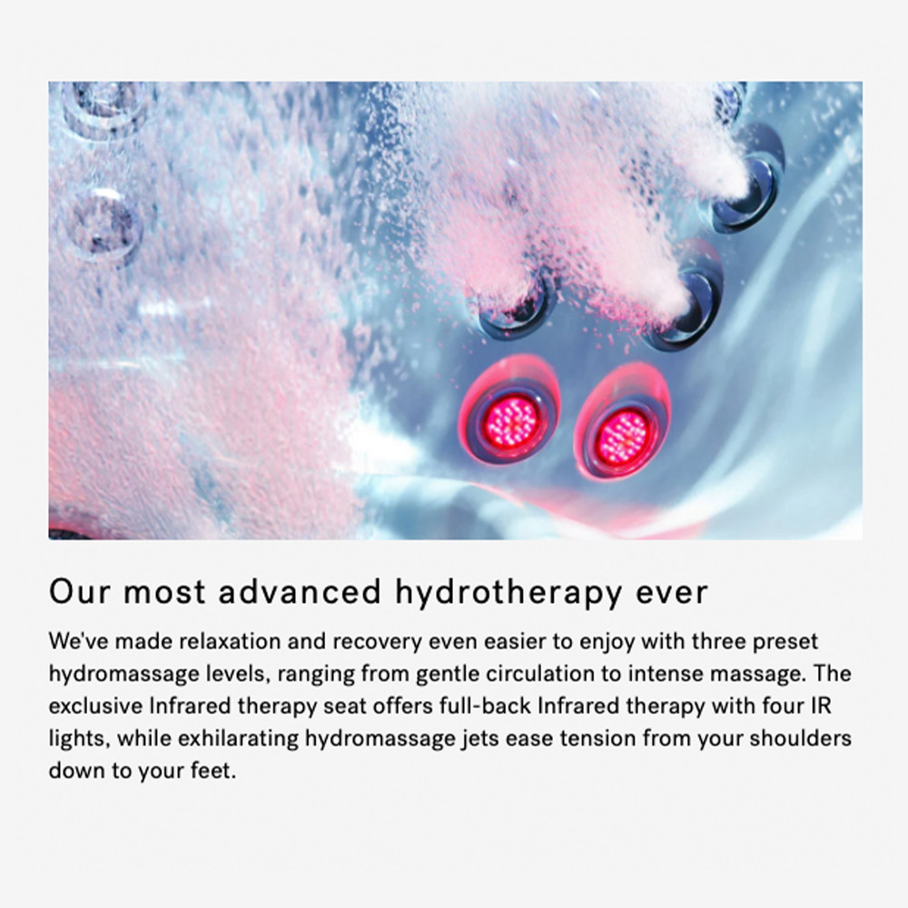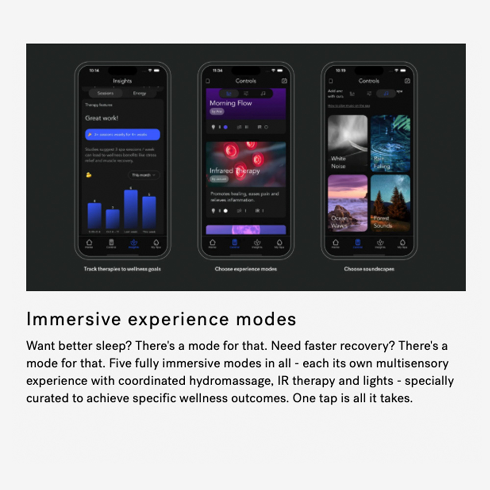 • Five immersive experience modes feature a unique coordinated blend of hydromassage, IR therapy, and lights