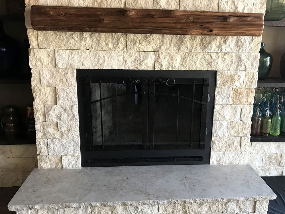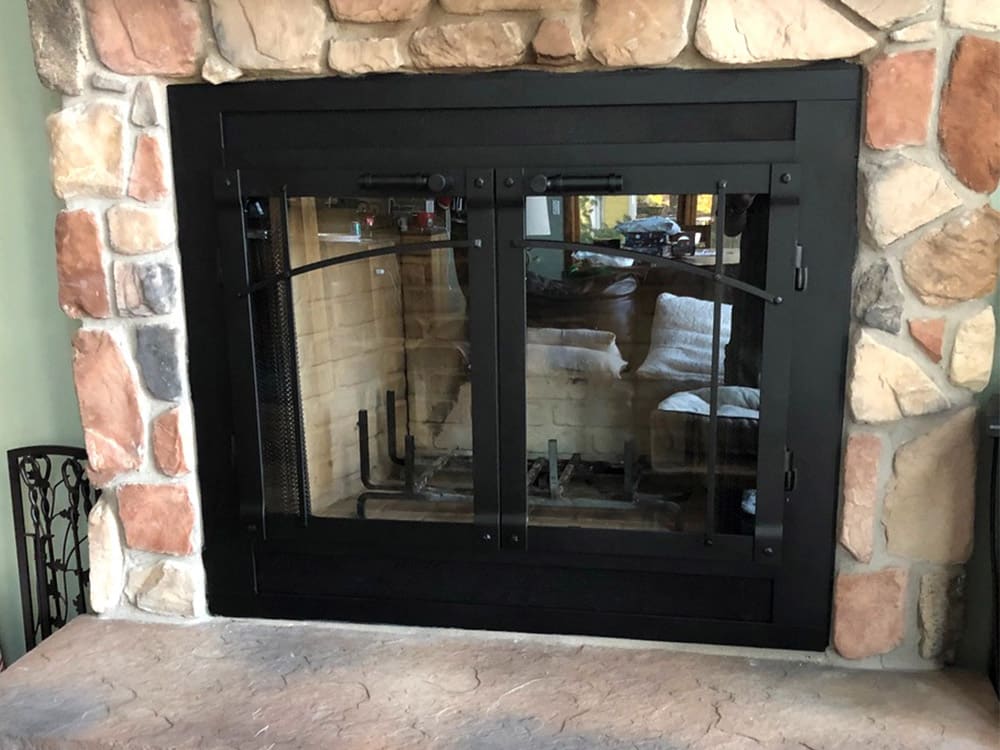Fireplace Refacing Option. Turn your old louvered fireplace into a gorgeous focal point. Choose from our six most popular door types and all nine door designs. This door will incorporate your louvers with our designs and provide you a new updated look.