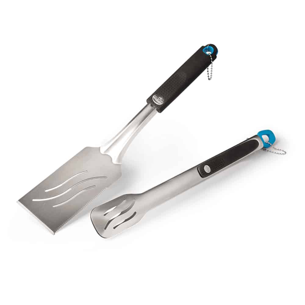 Every grill-master needs a spatula and some tongs in order to prepare great food on the BBQ. This Napoleon 2 Piece Toolset is made from durable stainless steel and features an ergonomic soft touch grip on both handles. The extra long spatula will easily flip and turn anything you wish to grill, easily managing food with its serrated edge and bladed tip. The pull tab on the tongs easily locks and unlocks and both barbecue tools are easily stored thanks to the built in tool hangers.