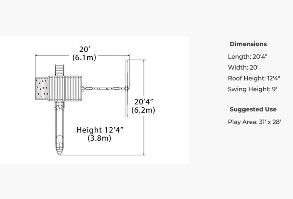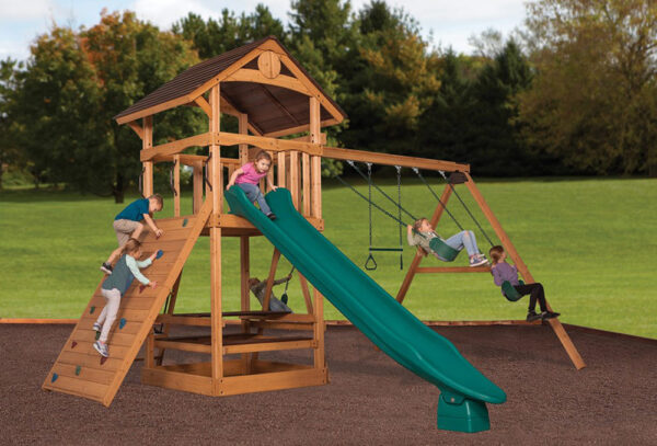 The Olympian Outlook XL 1A swing set is an excellent value. The fort structure has a 6′ high deck with over 25 sq. ft. of play space. This play structure also includes wood roof, gable kit, 3 position swing beam, 2 – belt swings, trapeze bar, 6′ rock wall, picnic table, and 12′ rocket slide. Summit Outlook play sets include a limited lifetime warranty on all wood, metal, and hardware components.