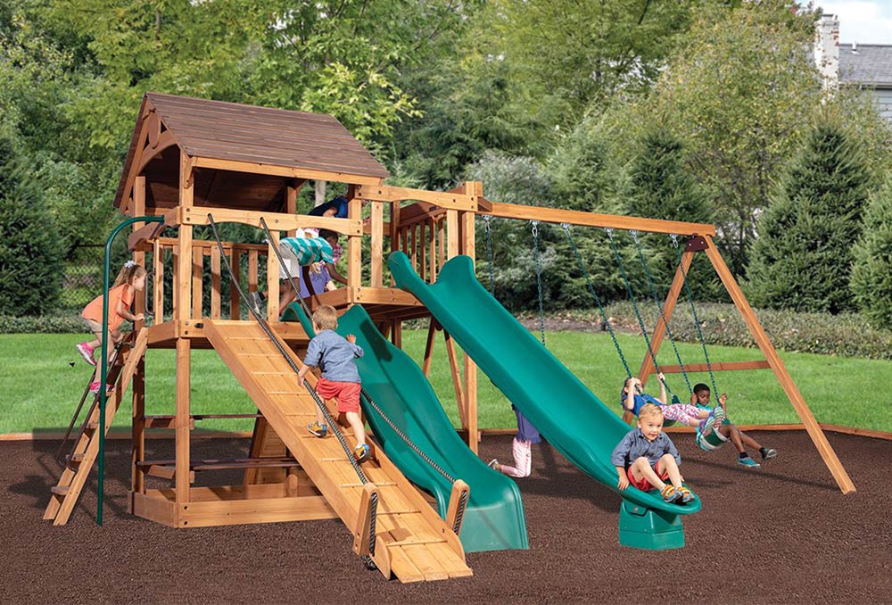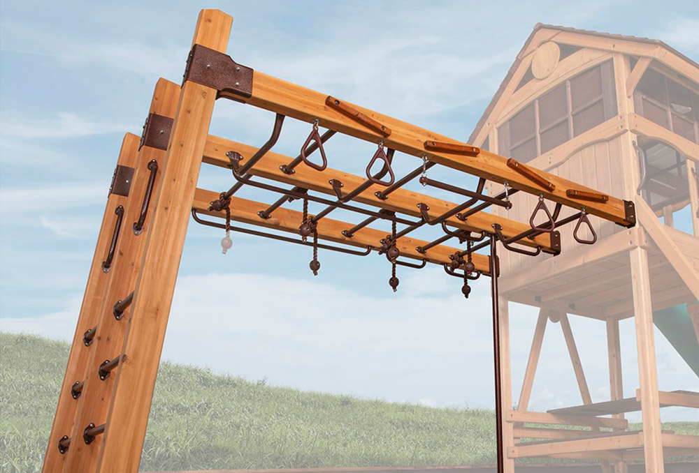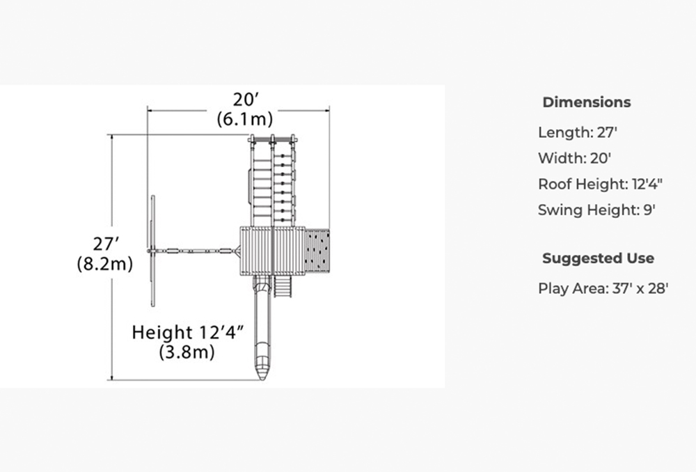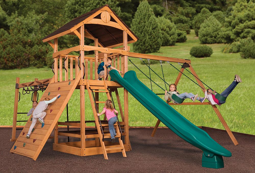 The Olympian Outlook XL 1B swing set features the Ultimate Climber loaded with all kinds of strength, dexterity, and climbing features! The fort structure has a 6′ high deck with over 25 sq. ft. of play space. This play structure also includes wood roof, gable kit, 3 position swing beam, 2 – belt swings, trapeze bar, ultimate climber, 6′ rock wall, picnic table, and 12′ rocket slide. Summit Outlook play sets include a limited lifetime warranty on all wood, metal, and hardware components.