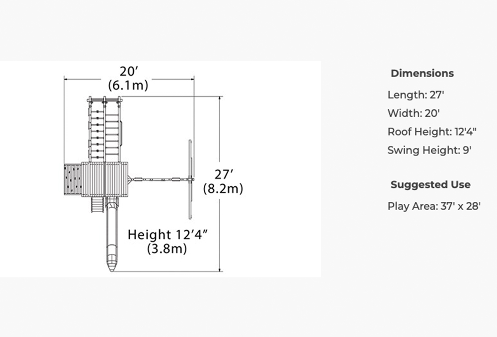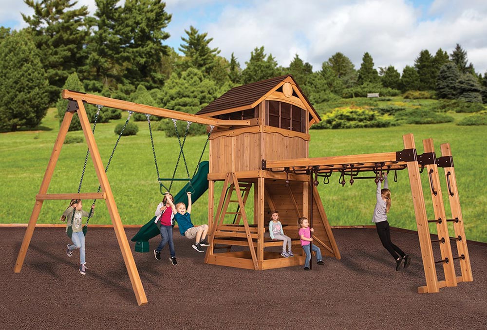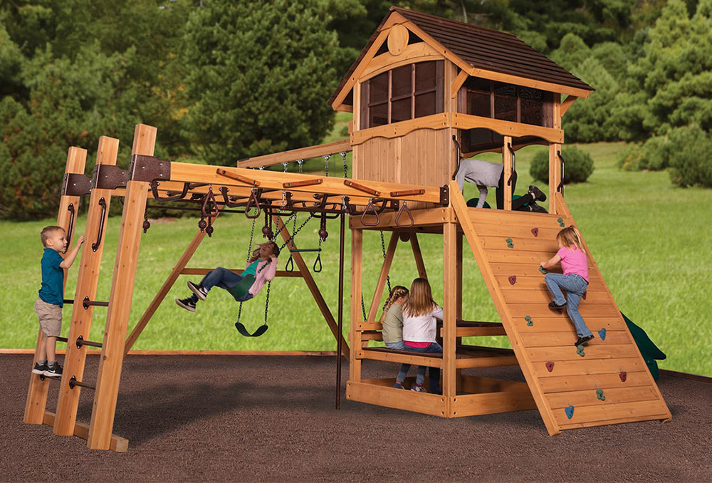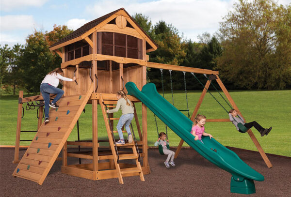 The Olympian Outlook XL 1C swing set features the Ultimate Climber loaded with all kinds of strength, dexterity, and climbing features! It also includes the cabin package for an enclosed upper fort experience. The fort structure has a 6′ high deck with over 25 sq. ft. of play space. This play structure also includes wood roof, gable kit, cabin package, 3 position swing beam, 2 – belt swings, trapeze bar, ultimate climber, 6′ rock wall, picnic table, and 12′ rocket slide. Summit Outlook play sets include a limited lifetime warranty on all wood, metal, and hardware components.