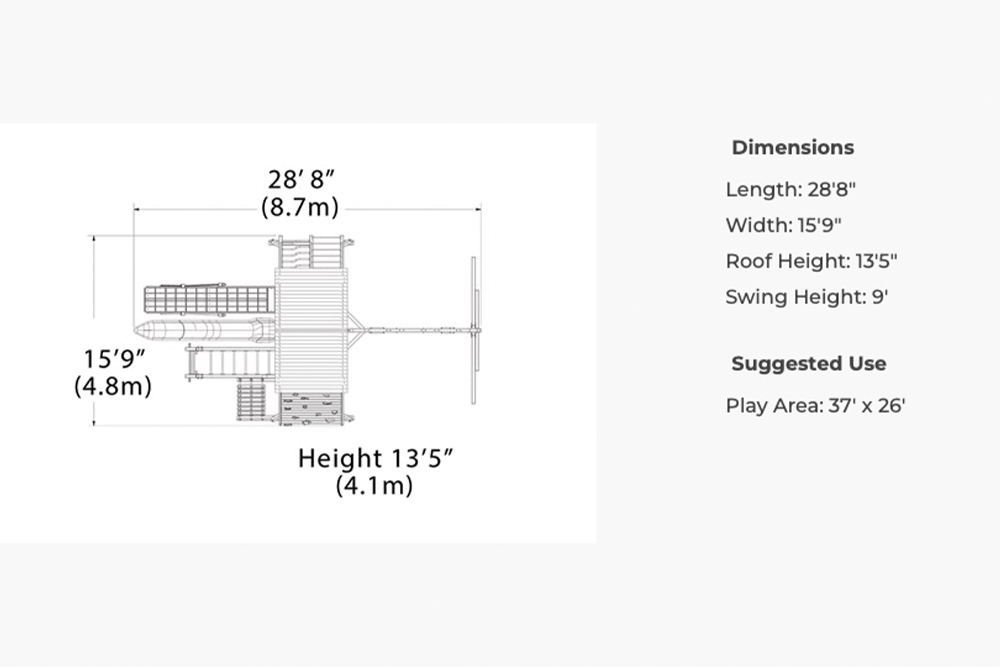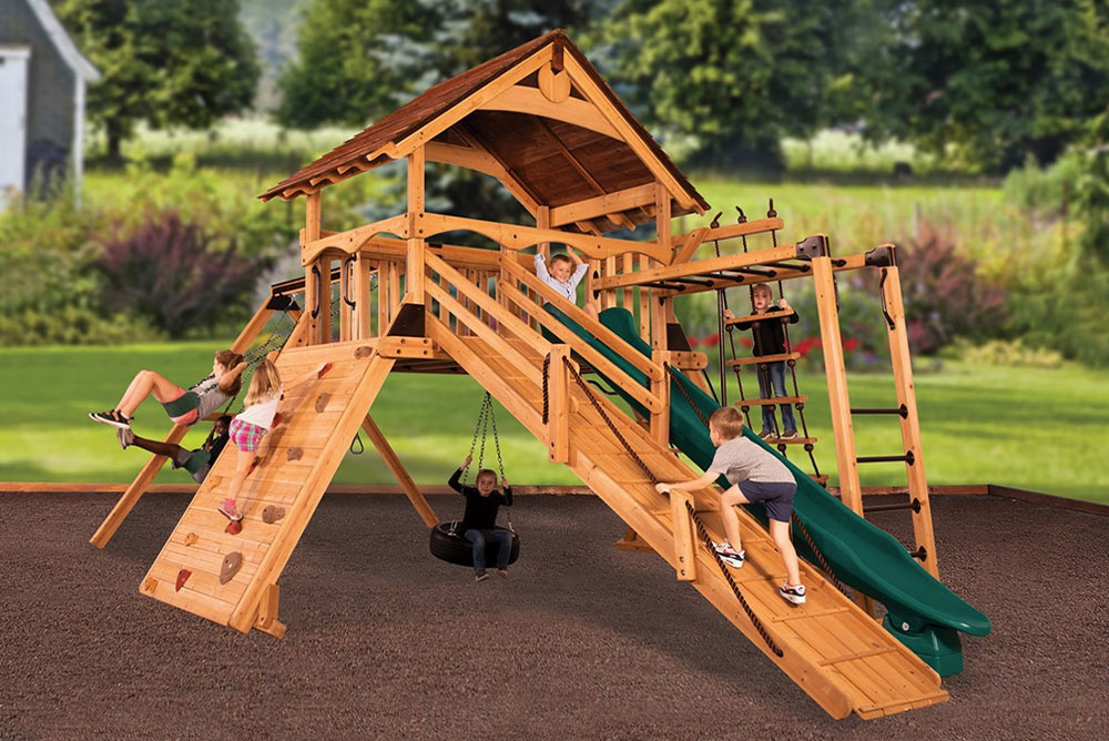 The Olympian Peak Jumbo 2 playset features three awesome play features up front on the huge triple activity wall! The fort structure has a 6′ high deck with 44 sq. ft. of play space. This playset also includes a wood roof, 2 – gable kits, 3 position 9′ swing beam, 2 – belt swings, trapeze bar, 12′ rocket slide, gang plank, monkey bars, fireman’s pole, and an accessory arm with rope ladder. Peak Series play sets include our exclusive limited lifetime warranty on all wood, metal, and hardware components.