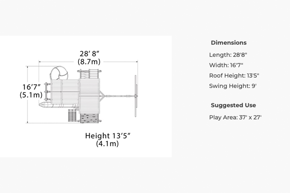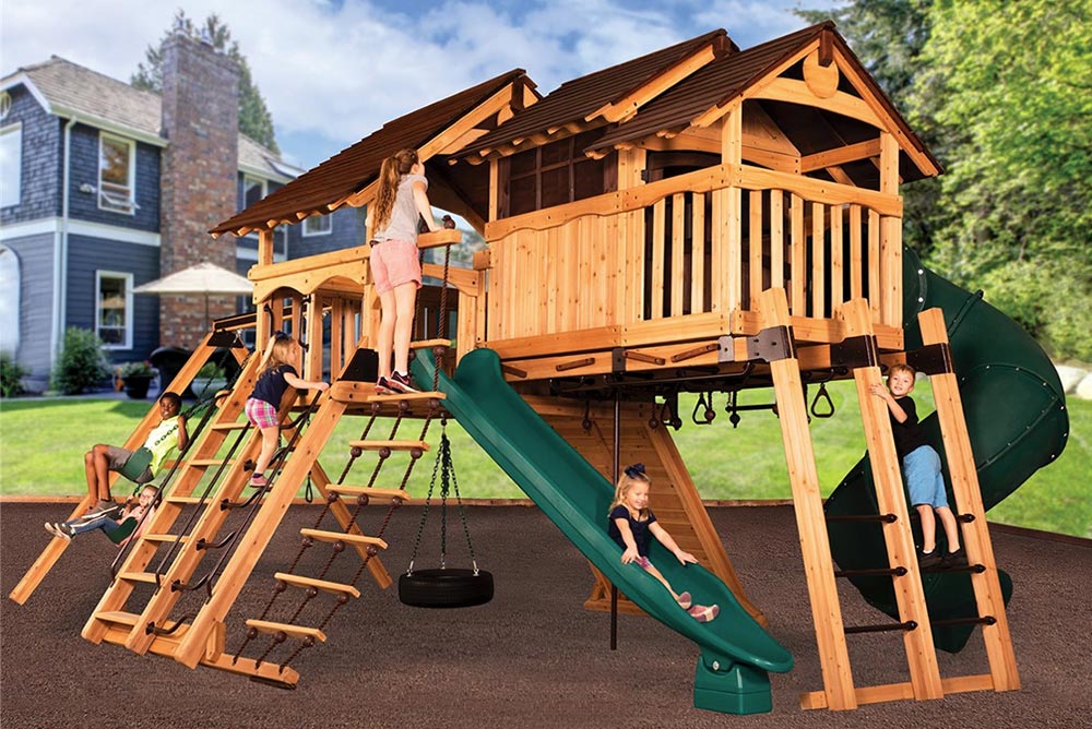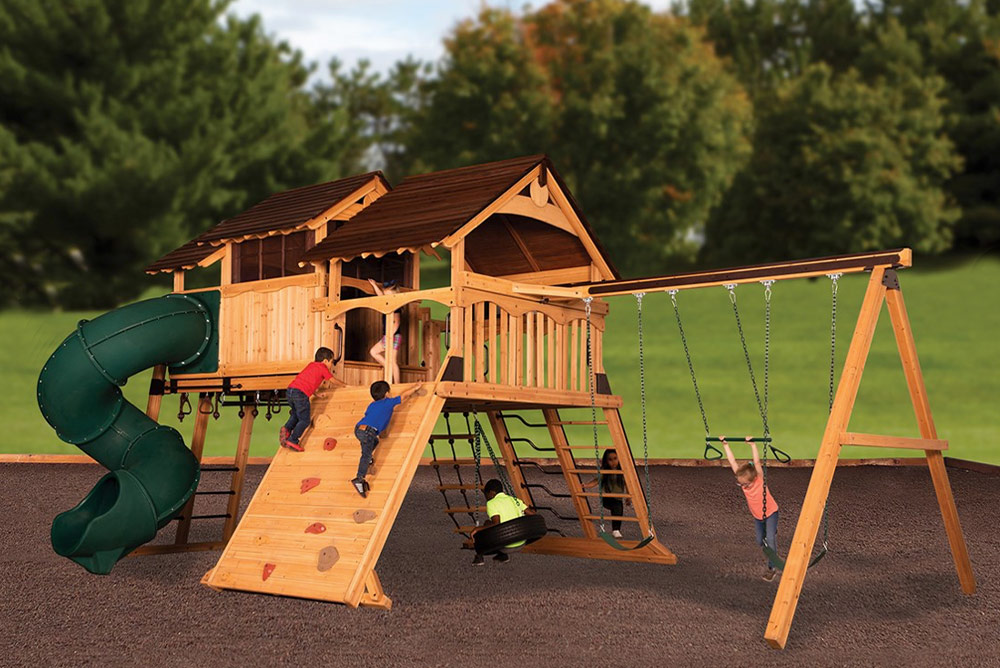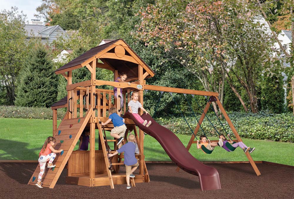 The Olympian Peak Jumbo 3 playset will keep your children and their friends entertained for year with so many safe, yet challenging, play features! The fort structure has 6′ and 7′ high decks with 84 sq. ft. of play space. This playset also includes wood roofs, 2 – gable kits, upper cabin package, 3 position 9′ swing beam, 2 – belt swings, trapeze bar, 12′ rocket slide, 7′ spiral tube slide, 6.5′ ultimate climber monkey bars, and an accessory arm with rope ladder. Peak Series play sets include our exclusive limited lifetime warranty on all wood, metal, and hardware components.