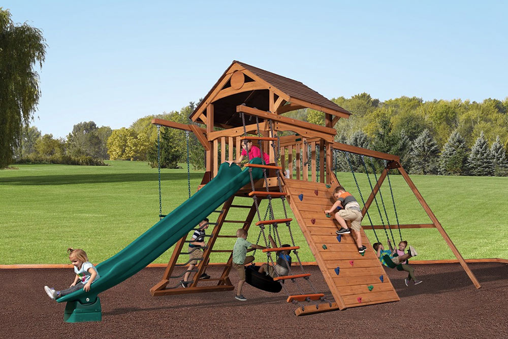 The Olympian Summit XL 1 swing set comes standard with incredible value. The fort structure has a 6′ high deck with over 25 sq. ft. of play space. This play structure also includes wood roof XL, gable kit, accessory arm with rope ladder, accessory arm with trapeze bar, 3 position 9′ swing beam, 3 – belt swings, and 12′ rocket slide. Summit Outlook play sets include a limited lifetime warranty on all wood, metal, and hardware components.