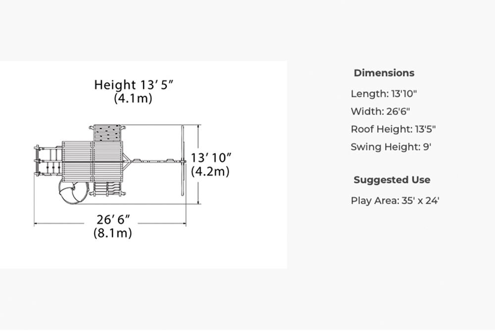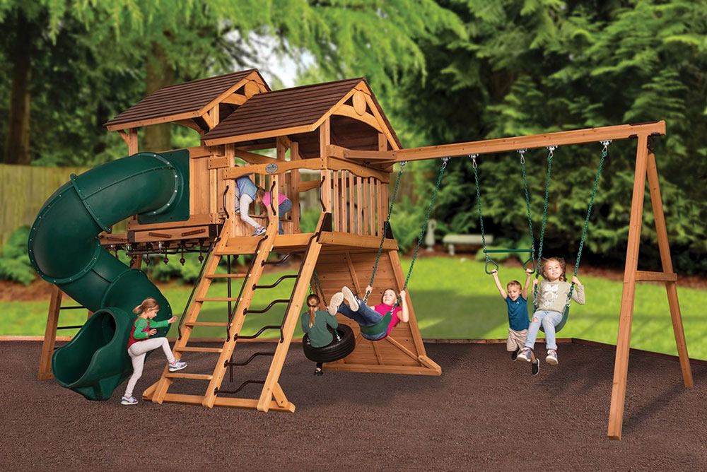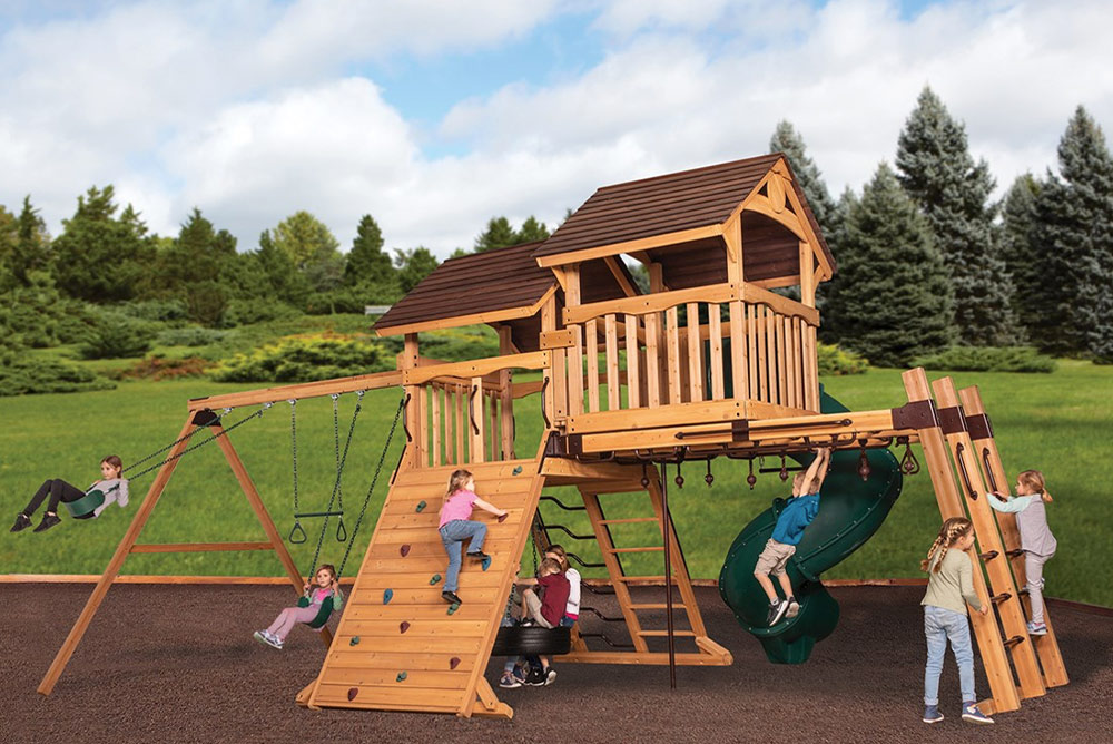 The Olympian Summit XL 3 swing set is packaged with the ultimate climber and loft xl as a perfect match for the ever popular 7′ sprial tube slide . The fort structure has 6′ and 7′ high decks with over 50 sq. ft. of play space. This play structure also includes wood roof XL, gable kit, 3 position 9′ swing beam, 2 – belt swings, trapeze bar, ultimate climber, loft xl, and 7′ spiral tube slide. Summit Outlook play sets include a limited lifetime warranty on all wood, metal, and hardware components.