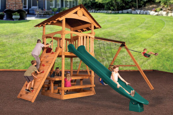 The Olympian Treehouse XL 1 swing set is built solid for parents and children to play together! The fort structure has a 6′ high deck with 30 sq. ft. of play space. This swing set also includes a wood roof, 2 – gable kits, 3 position 9′ swing beam, 2 – belt swings, trapeze bar, 12′ rocket slide, and a picnic table. Treehouse Series play sets include our exclusive limited lifetime warranty on all wood, metal, and hardware components.