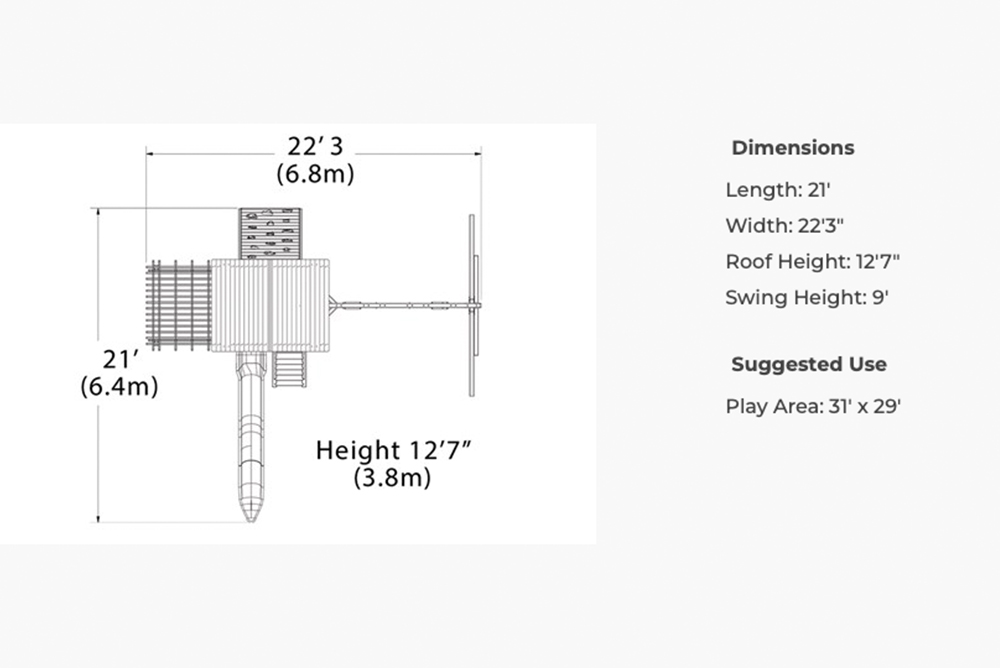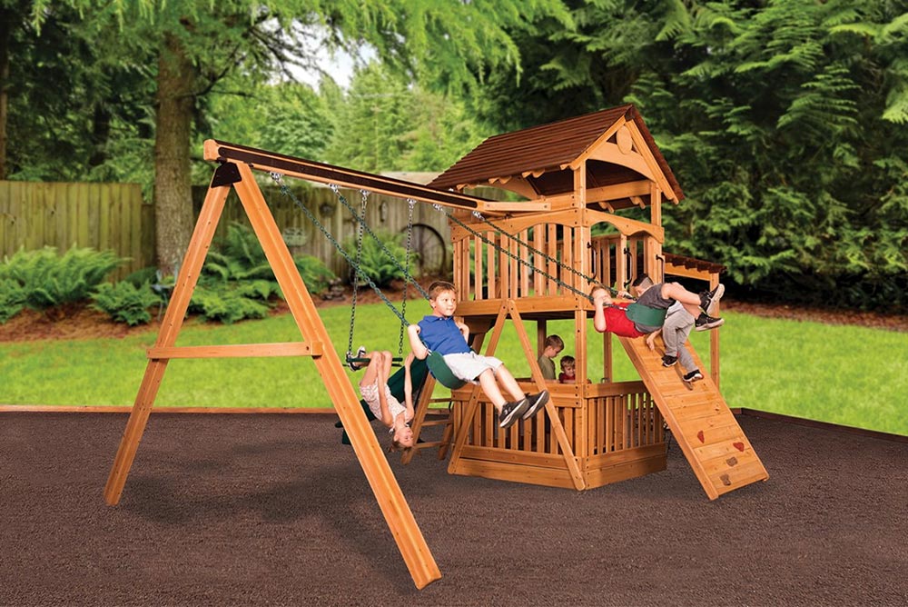 The Olympian Treehouse XL 2 features the brand new pergola for wooden swing sets! The fort structure has a 6′ high deck and a ground level play area with 60 sq. ft. of play space. This swing set also includes a wood roof, 2- gable kits, 3 position 9′ swing beam, 2 – belt swings, trapeze bar, 12′ rocket slide, pergola, and the kitchenette. Treehouse Series play sets include our exclusive limited lifetime warranty on all wood, metal, and hardware components.
