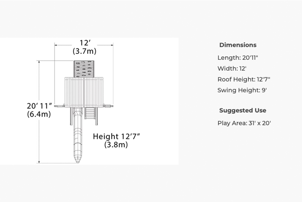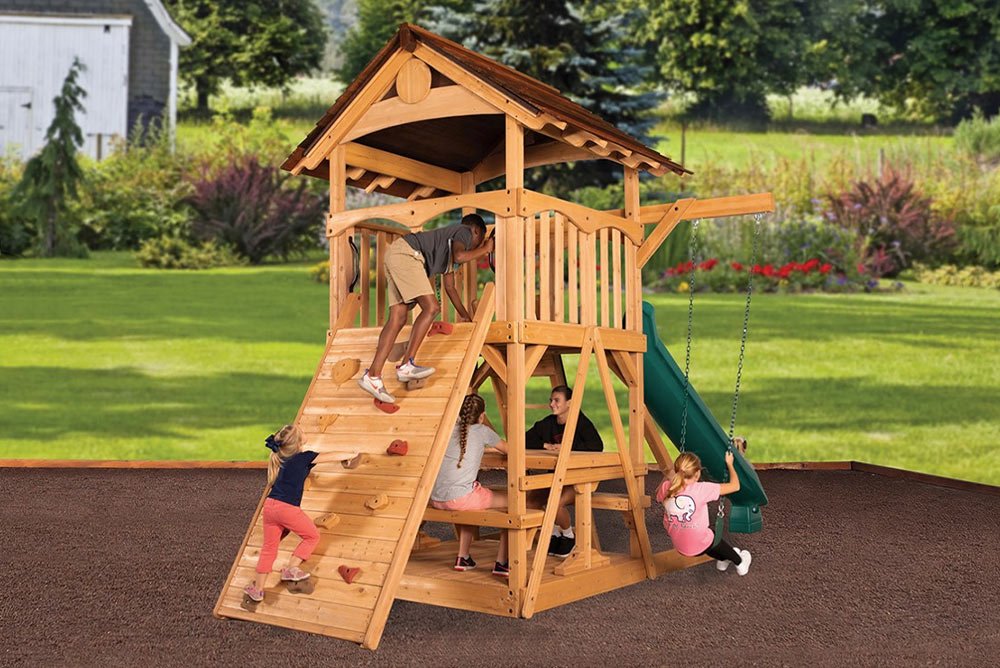 The Olympian Treehouse XL 2 Space Saver swing set is compact and designed to fit into almost any backyard space with lots of play value! The fort structure has a 6′ high deck with 30 sq. ft. of play space. This swing set also includes a wood roof, 2 – gable kits, 2 position 9′ swing beam, belt swing, trapeze bar, 12′ rocket slide, 6′ rock wall, lower floor, picnic table. Treehouse Series play sets include our exclusive limited lifetime warranty on all wood, metal, and hardware components.