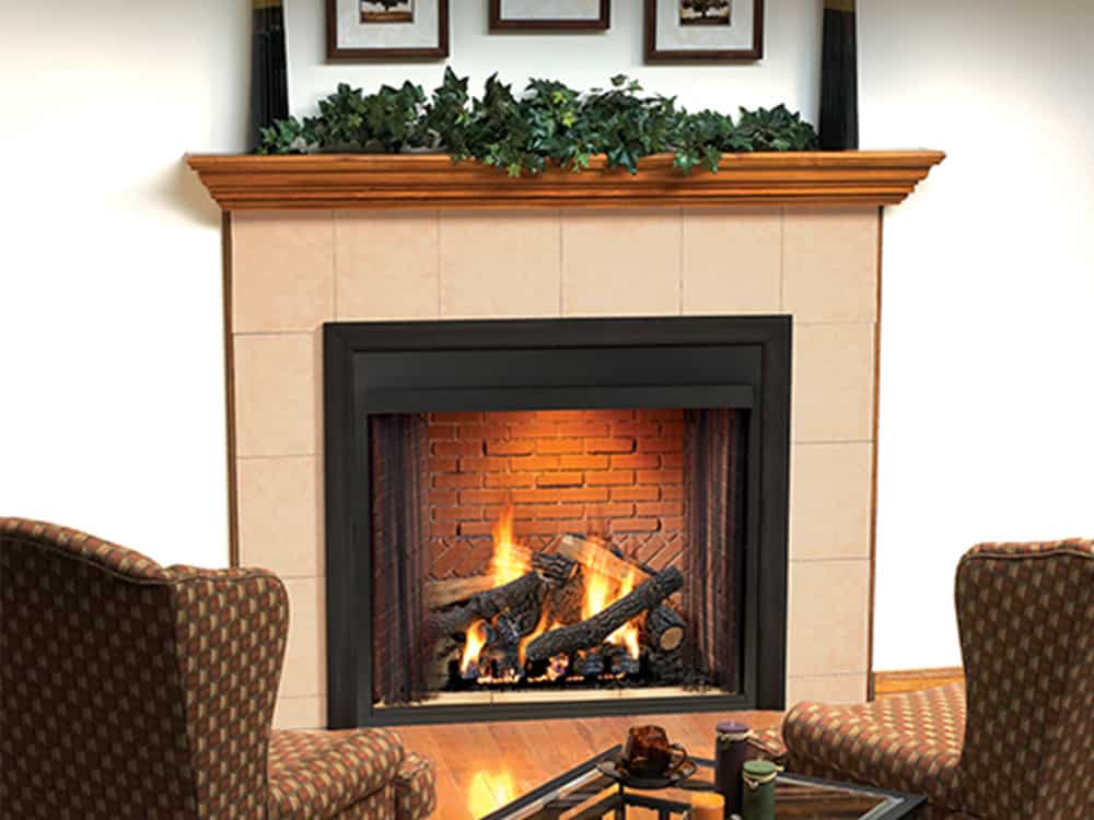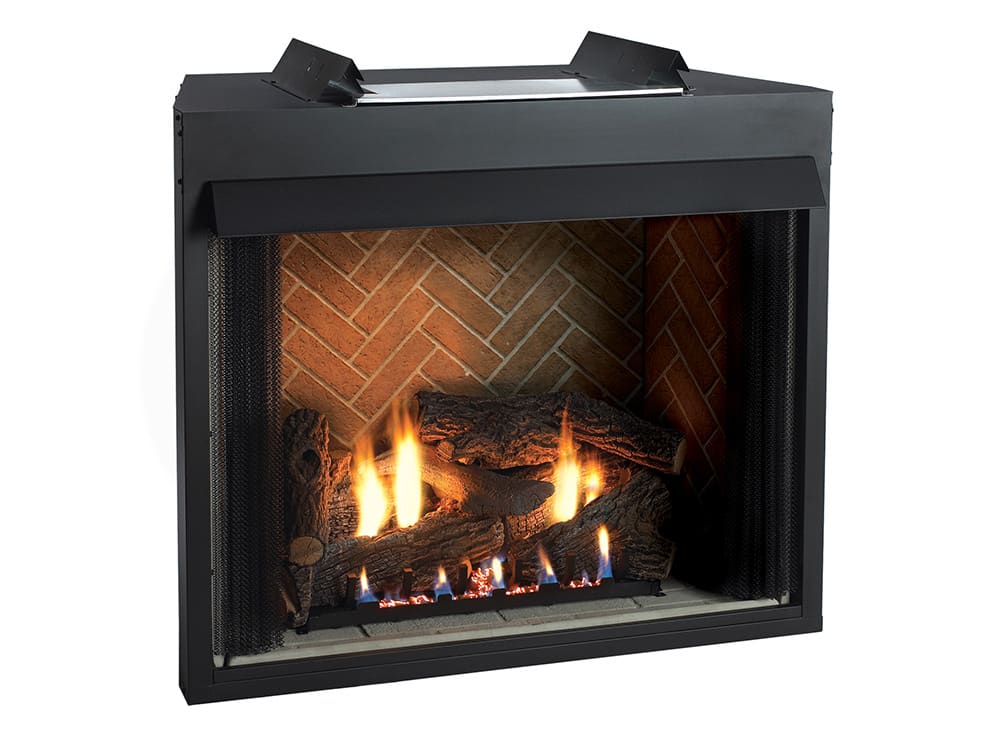 Our unique Jefferson Select vent-free gas firebox features a tall, deep stage for the log set, yet has compact outer dimensions and a low-profile top and bottom. The visual effect is a lot more fireplace with less of the firebox face showing.