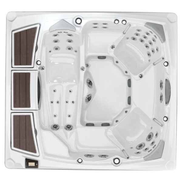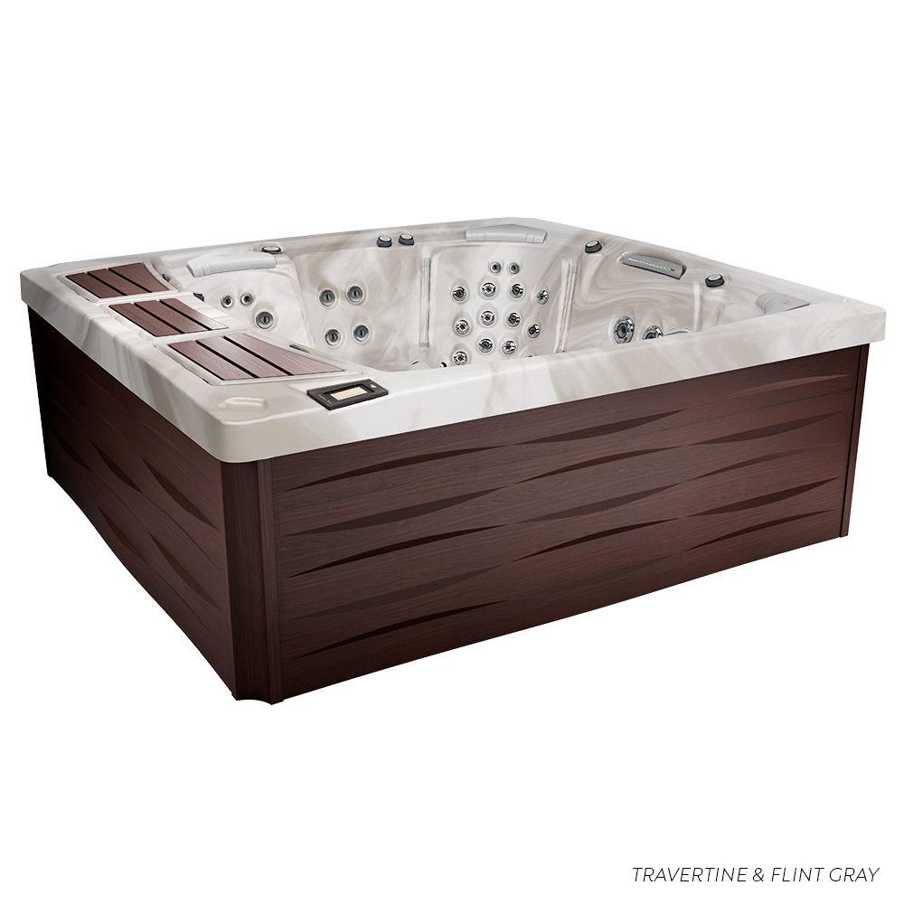 Fall in love at first sight with the crisp, rhythmic texture of the exterior cabinetry highlighted by corner illumination. This eye-catching combination of classic beauty and architectural form is further enhanced by a low-profile flat top rail and beautiful lounge deck with illuminated SunCooler™ cold storage areas for additional seating and convenience. Reminiscent of a reclining chair, the lounge seat is molded to support your body in comfort allowing you to lay back and relax without the worry of floating around. As you surrender fatigued muscles in your neck, back, hips wrists, legs and feet, an amazing full-body massage delivers total relaxation. Throughout the rest of the Claremont® spa, wide seats inspired by some of our most popular models are highlighted by the even glow of LED lighting for both beauty and safety. Silent Air™ injector jets and SunScents® Aromatherapy further enhance the incredible experience.