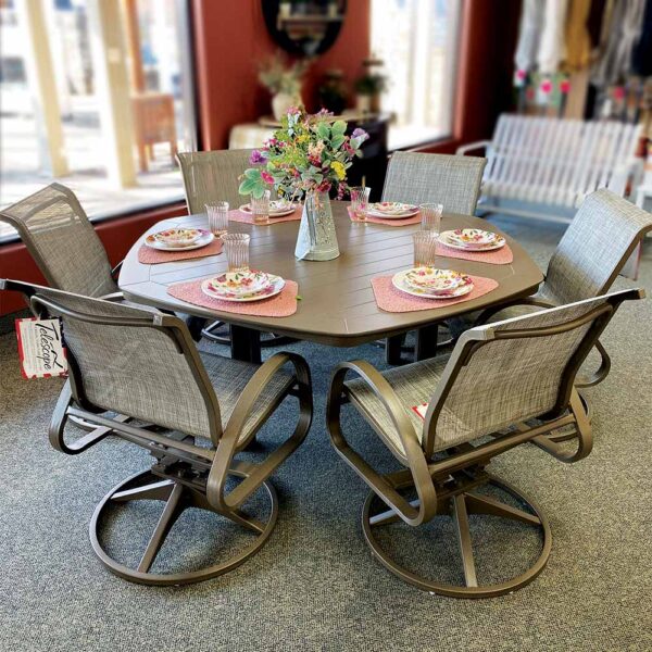 Includes || 62″ hexagon dining table, 6 swivel dining chairs