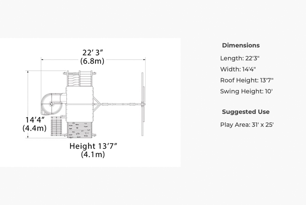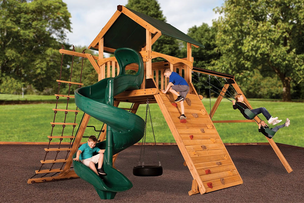 The Titan Peak XL 2 playset is full of spinning fun with the open spiral slide and tire swivel swing! The fort structure has a 7′ high deck with 30 sq. ft. of play space. This playset also includes a tarp roof, 3 position 10′ swing beam, 2 – belt swings, trapeze bar, 7′ open spiral slide, and an accessory arm with rope ladder. Peak Series play sets include our exclusive limited lifetime warranty on all wood, metal, and hardware components.