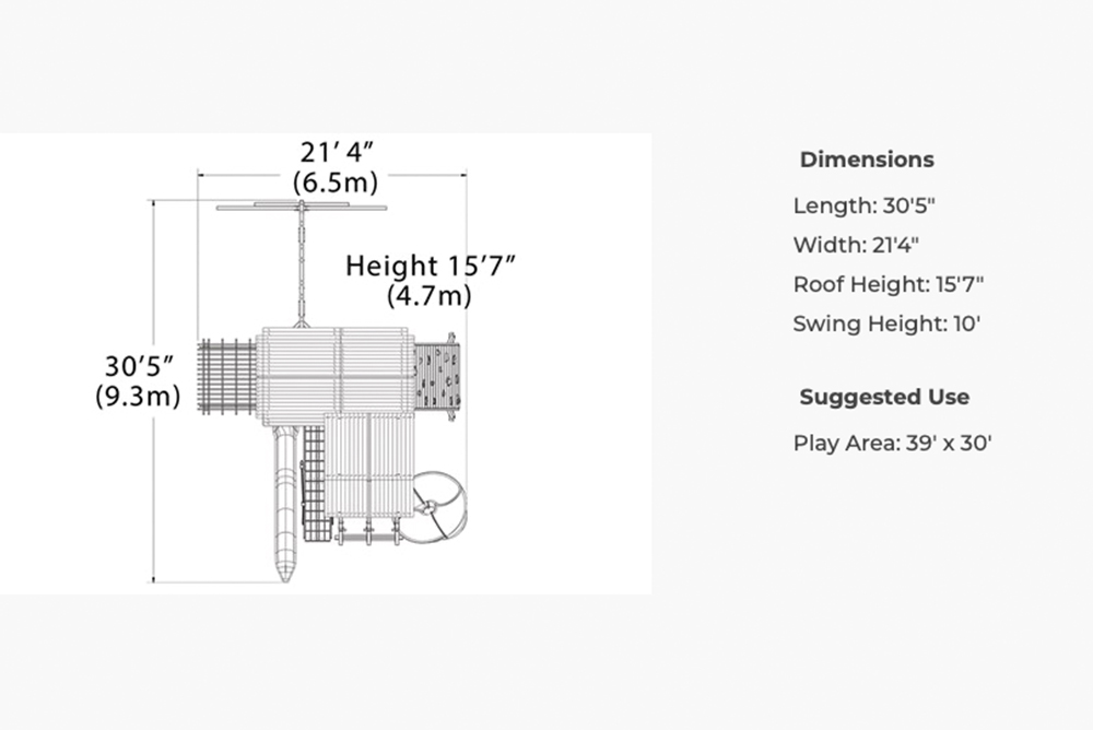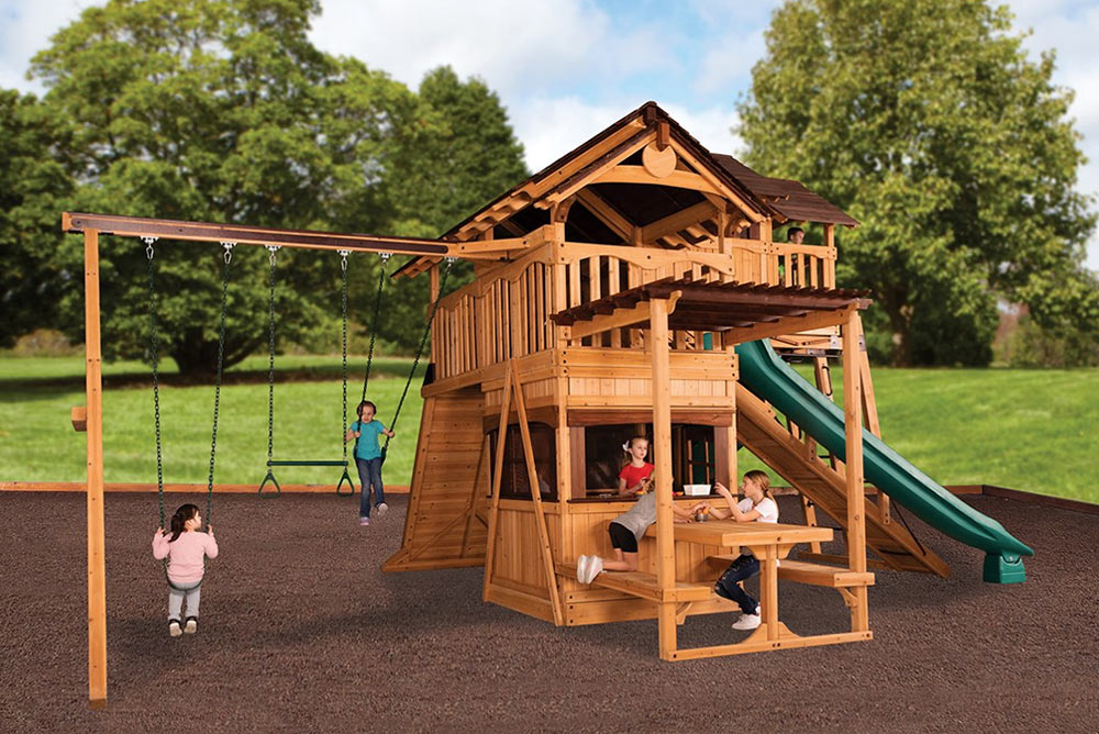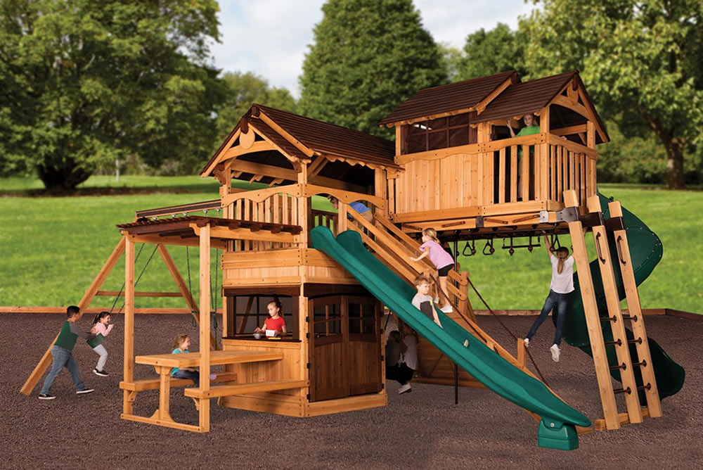 The Titan Treehouse XL 10 swing set is the ultimate hybrid style backyard play system combining all the benefits of square base and angled base structures into one giant play experience! The fort structure has a 7′ high deck, 9′ high deck, and a lower playhouse with 130 sq. ft. of play space. This swing set also includes wood roofs, gable extension roof, gable kit, 3 position 10′ swing beam, 2 – belt swings, trapeze bar, loft XL, loft porch, upper cabin package, 14′ rocket slide, 9′ spiral tube slide, 7′ rock wall, gang plank, 8.5′ high ultimate climber monkey bars, tire swivel swing, and a pergola with side table. Treehouse Series play sets include our exclusive limited lifetime warranty on all wood, metal, and hardware components.