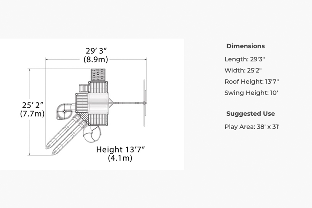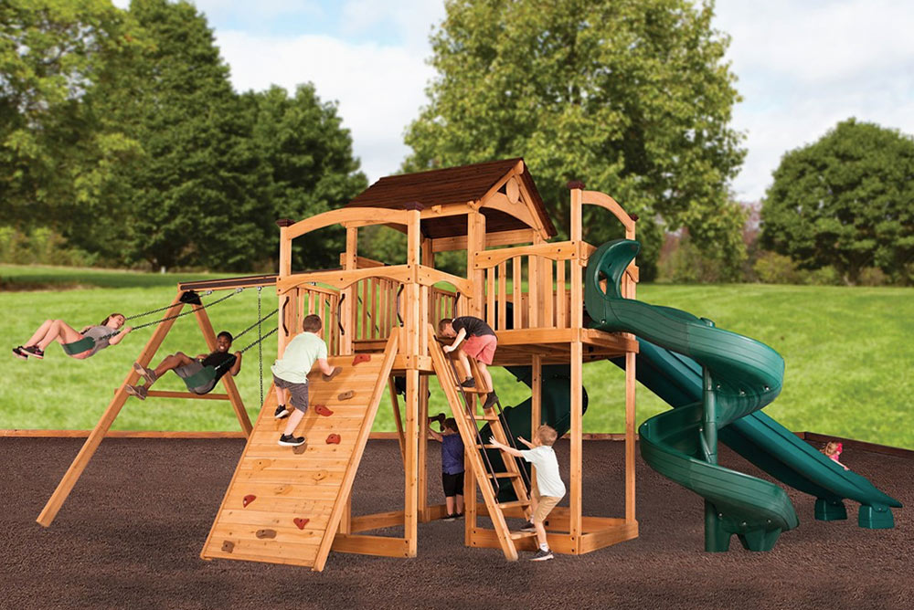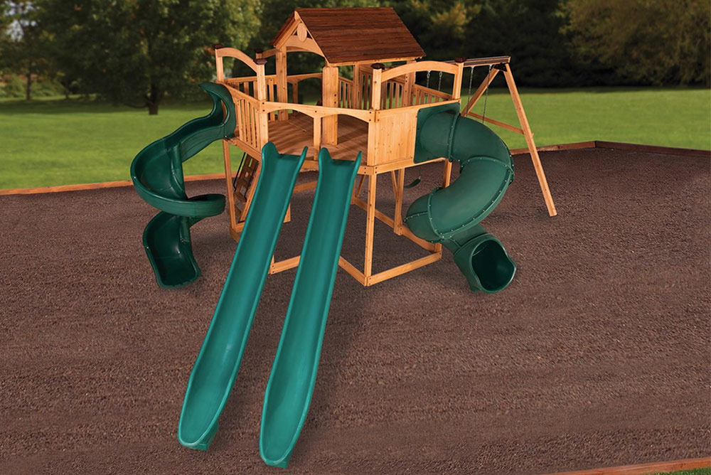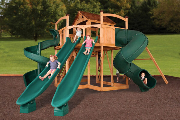 The Titan Treehouse XL 11 swing set introduces the new wrap-around-porch design with unlimited potential for swing set accessories in all directions! The fort structure has a 7′ high deck with over 103 sq. ft. of play space. This swing set also includes a wood roof, 2 – gable kits, 3 position 10′ swing beam, 2 – belt swings, trapeze bar, 2 – 14′ rocket slides, 7′ open spiral slide, 7′ spiral tube slide, and a 6′ rock wall. Treehouse Series play sets include our exclusive limited lifetime warranty on all wood, metal, and hardware components.