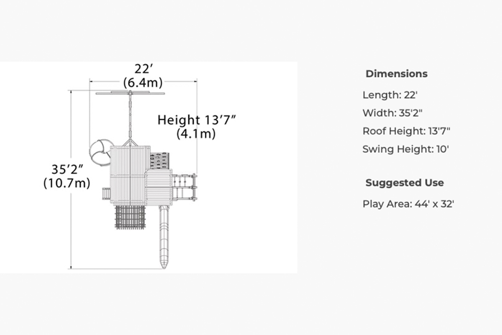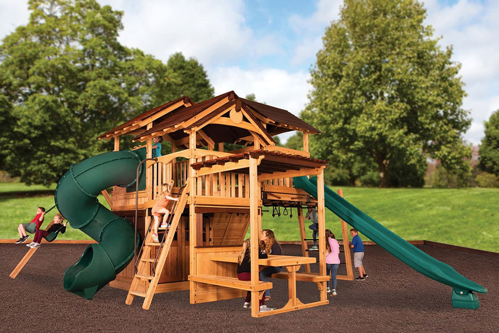 The Titan Treehouse XL 7 swing set a premium backyard play structure for the whole family! The fort structure has two 7′ high decks, a 6′ tower, and a lower playhouse with 115 sq. ft. of play space. This swing set also includes wood roofs, gable extension roof, 2 – gable kits, 3 position 10′ swing beam, 2 – belt swings, trapeze bar, 14′ rocket slide, 7′ spiral tube slide, 7′ rock wall, 6.5′ high ultimate climber monkey bars, pergola with side table, extra playhouse wall, and a 6′ fireman’s pole. Treehouse Series play sets include our exclusive limited lifetime warranty on all wood, metal, and hardware components.