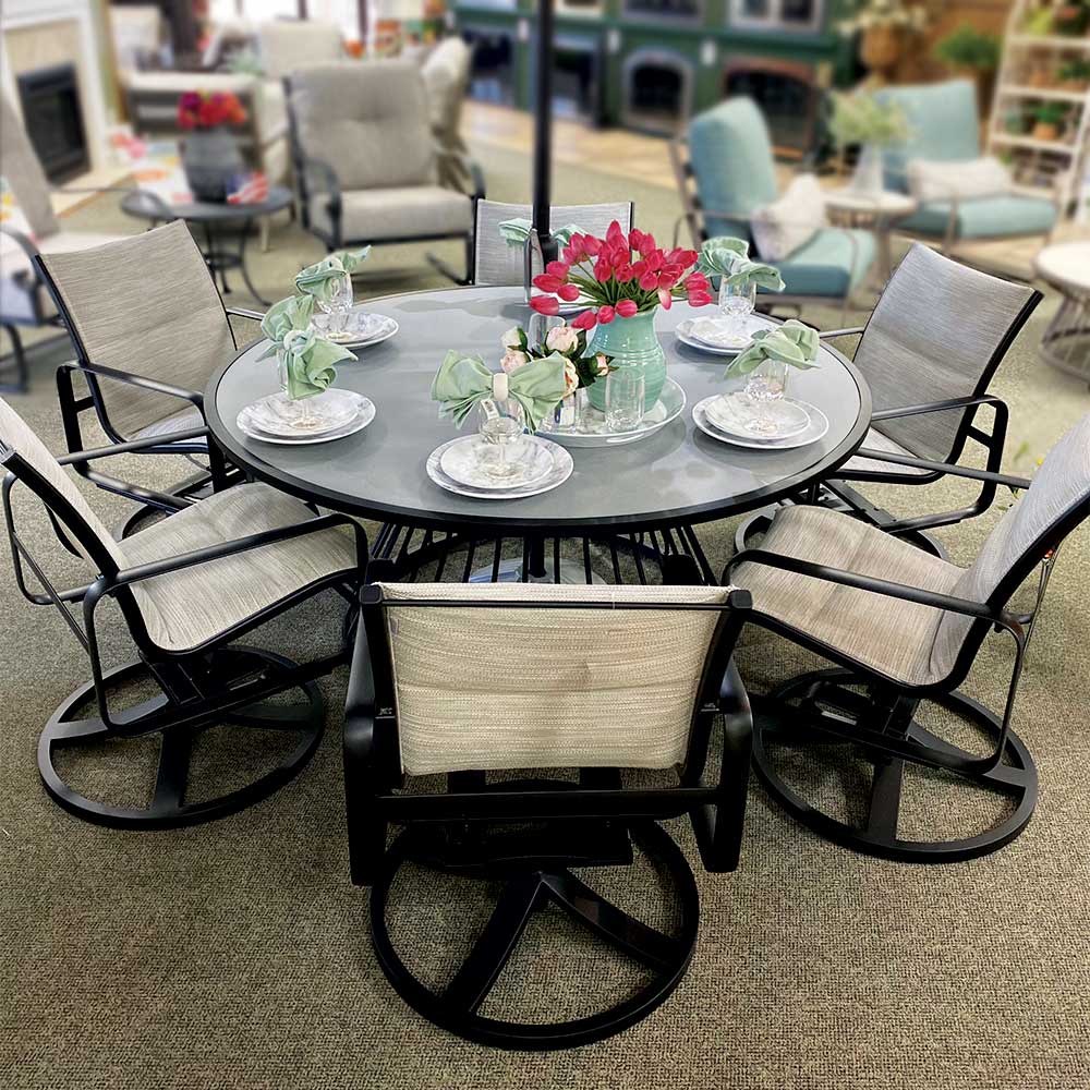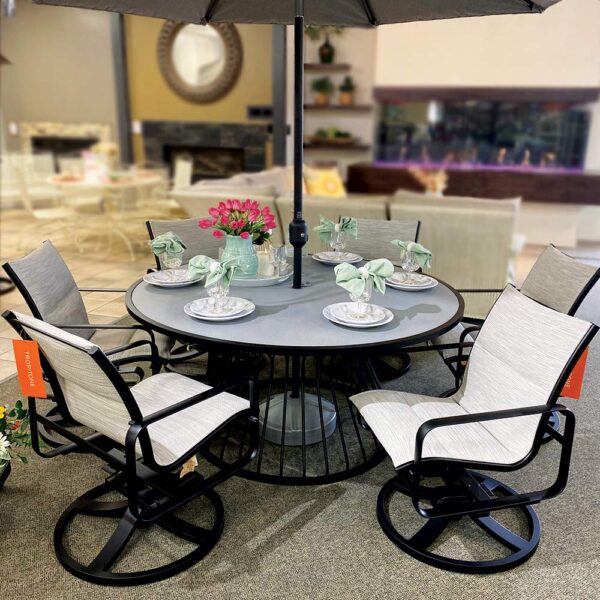Includes // 60″ dining table, 6 padded swivel chairs