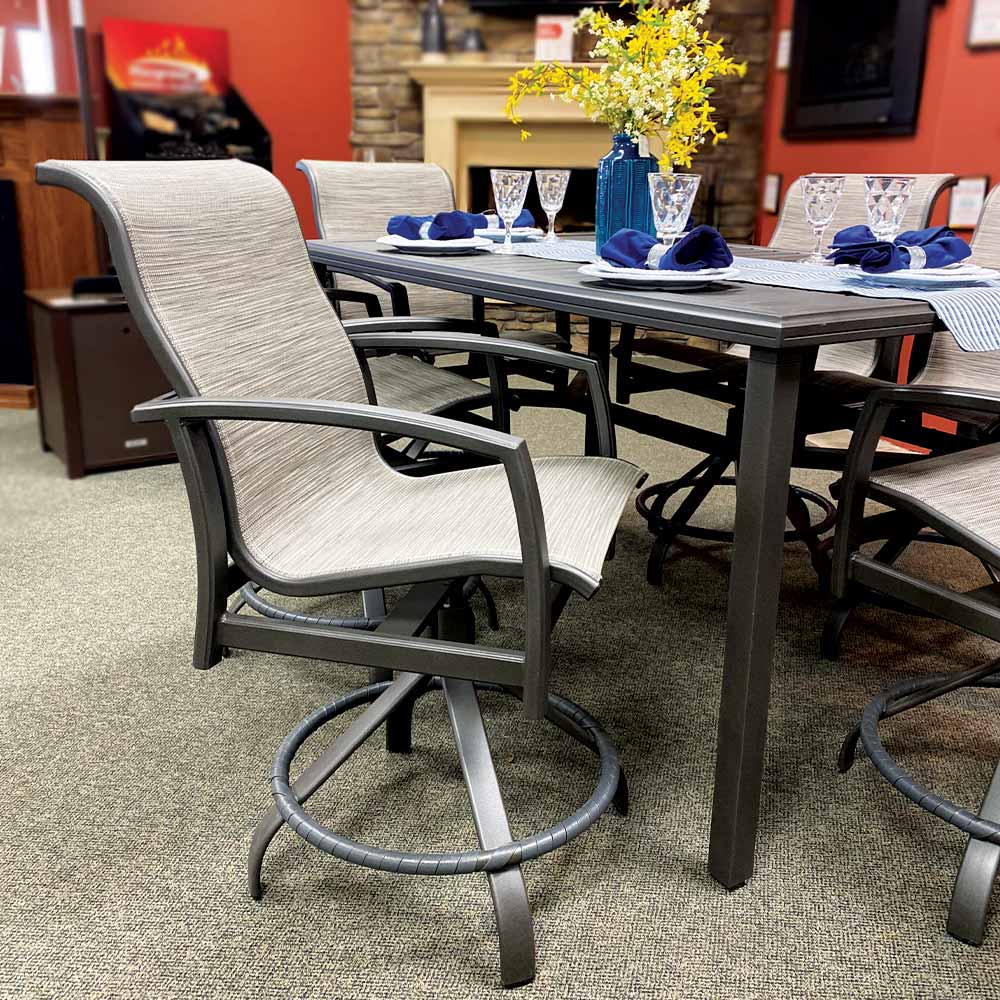 Includes || 66 x 42″ counter-height dining table, 6 counter-height swivel bar stools